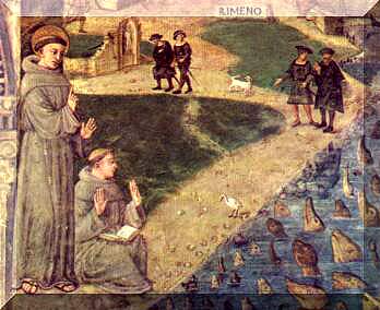 A legenda Szent Antal alakját sokféle történettel fonta körül: a gyermek Jézust a karján hordozta, vagy mint valamikor Ferenc a madaraknak, Antal a tengeri halaknak prédikált. A hagyomány szerint, amikor Riminiben Szent Antal halászoknak hirdette Isten igéjét, azok kigúnyolták őt. Antal szomorúan ment a Marecchia partjára, ott, ahol az az Adriába ömlik, és a tenger felé fordulva így kiáltott: "Halak! Jöjjetek! Legalább ti hallgassátok meg, mit beszélek Istenről!” Szavai hatására csoda történt: megmozdult a víz, és több ezer hal dugta ki a fejét a folyóból, majd a szent felé fordultak, és végighallgatták szónoklatát. A zord halászok erre megrémültek, majd magukba szálltak és megtértek.